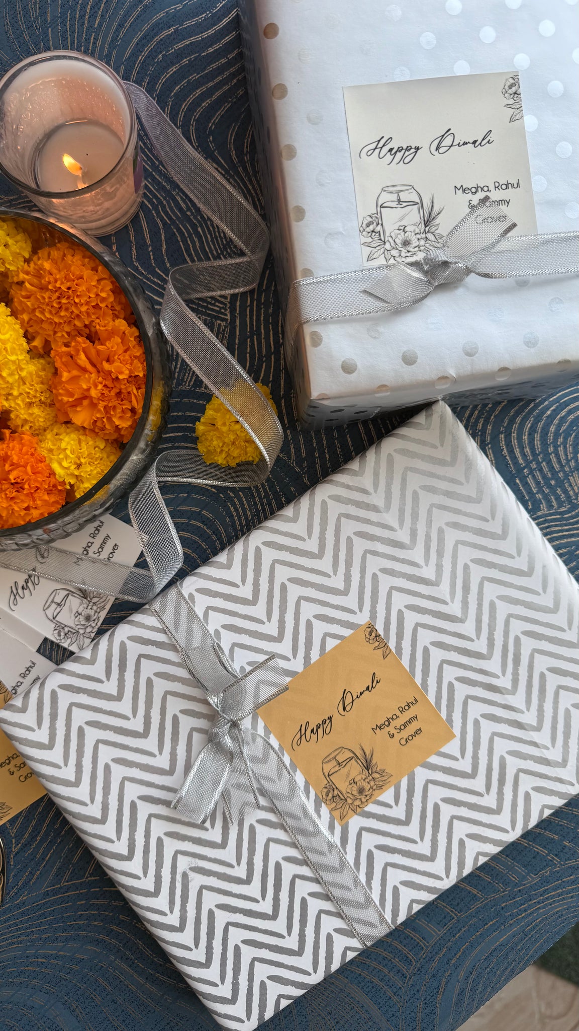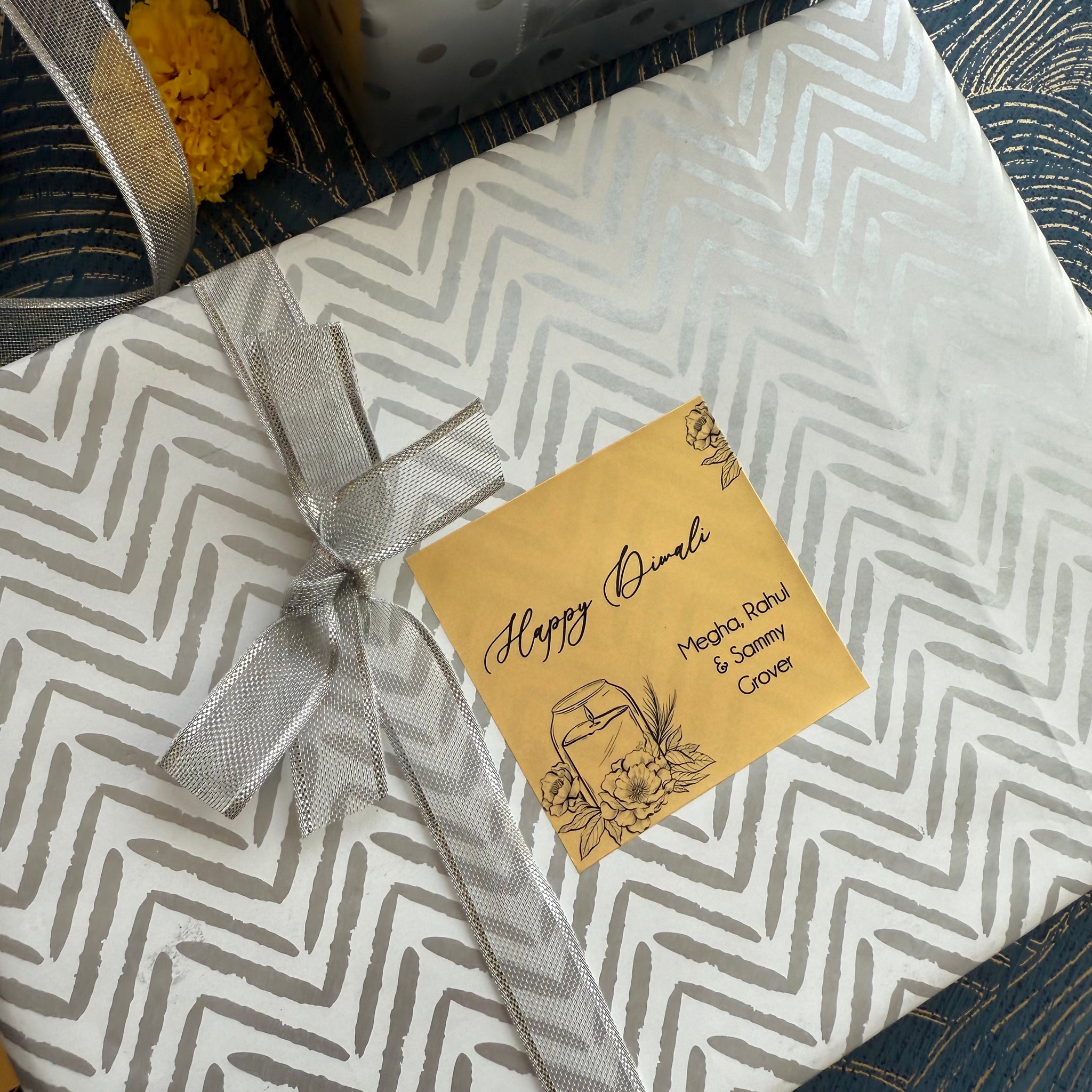 Add a festive sparkle to your gifts with the Candle of Joy gift label! Featuring a playful candle design, this label perfectly captures the warmth and joy of the Diwali season. It’s the perfect finishing touch to brighten up every present and celebrate the festival of lights with style. Choose from a subtle sheen gold or silver paper or an equal mix of both